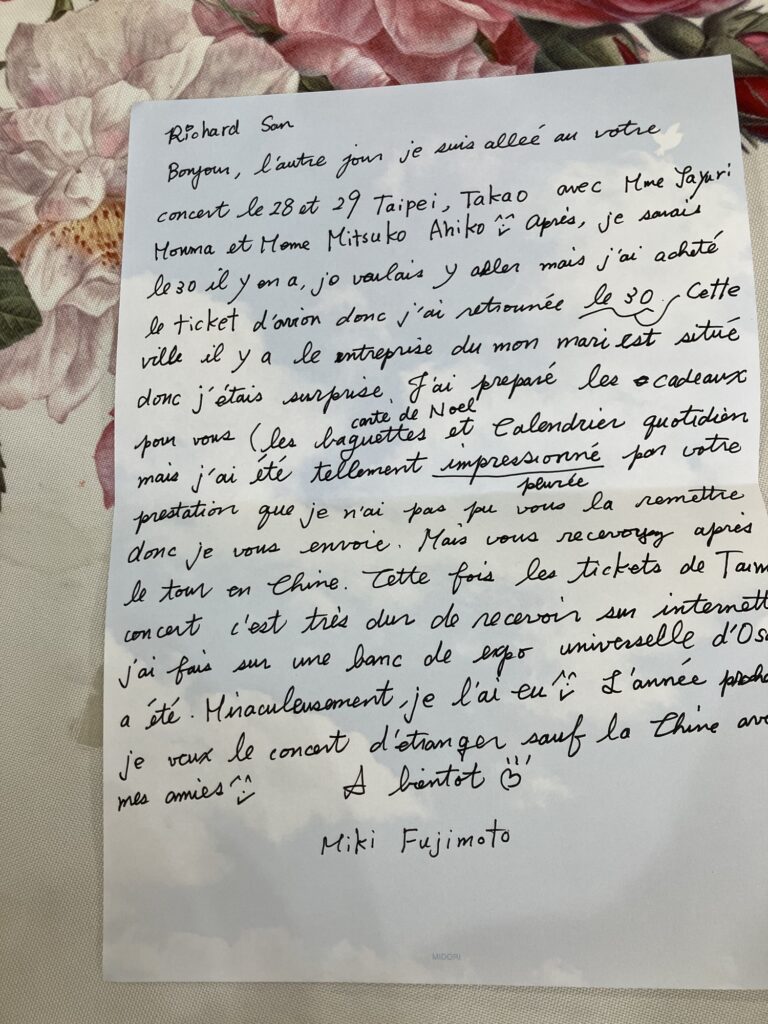 台北と高雄にりっちゃんコンサートに行ってきました。りっちゃんはシドニーとメルボルンでオーストラリア公演から台湾公演に来られました。熊本から直接飛行機が出てるのでなんと便利〜現地で東京からファンクラブのスタッフのお友達と待ち合わせして3人で行きました。台湾までは2時間で着きますから東京までと変わらず熊本は何気に地理的に動きやすいです。台湾は九州より小さいけどあんなすごい世界を作り出して改めて凄すぎる。台北が大都会なのは知ってるけど高雄もそれはそれは建物が凄く何でも大きい。物価も物凄く高くて、もう外国は今物価が高くなってるのが当たり前で日本に帰国してなんと日本は物価が安いんだと驚きました。町並みも可愛いのばっかり。皆さんほんとに顔つきが優しくて明らかに治安が良い国なので、やはりこういう可愛い絵とか音楽はどんどん街中に展示というか表に見える所に持ってこないと駄目だなぁと思いました。日本も頑張らないとです。りっちゃんは72歳ですが、全く衰えない技術にほんとにびっくりします。喜納昌吉さんの「花」と言う曲も弾いてくださり感激。ピアノは全公演ヤマハで演奏されました。会場はもちろん満席でものすごい盛り上がりで、チケットも1分以内に完売。チケット取るのも物凄く大変で、なんと大阪万博に行ってる時に発売だったので、ベンチの上で屋外で中国語のネットすぐ固まるしめちゃくちゃ難しい。ほんと言葉が出来ないって私の周りに中国語が出来る人いないけど、そういえばいとこのお姉ちゃん結婚して香港住んでたから、中国語ベラベラ外国語でが出来る方尊敬します。なんか飛行機は私だけ日本人で皆さんもちろんコンサートも飛行機も満席で物凄く日本人に優しく親切でびっくりしました。日本人とわかると即座に日本語を少し喋ってくださったり、熊本は熊本城や阿蘇山観光美味しい食べ物にお金を沢山使いに来て下さるので嬉しいです。演奏に圧倒されて手紙やお箸などプレゼントを渡す事が出来なかったので今日郵便局行ったけどめちゃくちゃ大変でした。トランプ関税の影響で、昔は簡単に国際郵便出来てたのがネットで事前に登録しなきゃいけないのだけど海外のページだからかローマ字で進めづらくめちゃくちゃ大変でした。10日位でパリに着きますとの事でしたが、りっちゃん合い変わらずクリスマスから年末2月まで中国だからフランス居ない〜追っかけのお友達とも大爆笑してりっちゃんやお友達から元気をもらいました。私もクリスマス演奏お仕事が複数入ってるから頑張るぞう^ – ^今日は忙しくてバイオリン弾いてないやばいあんな天才りっちゃんでさえ「続ける事毎日弾くことが大事です。努力努力です」と言われたので。