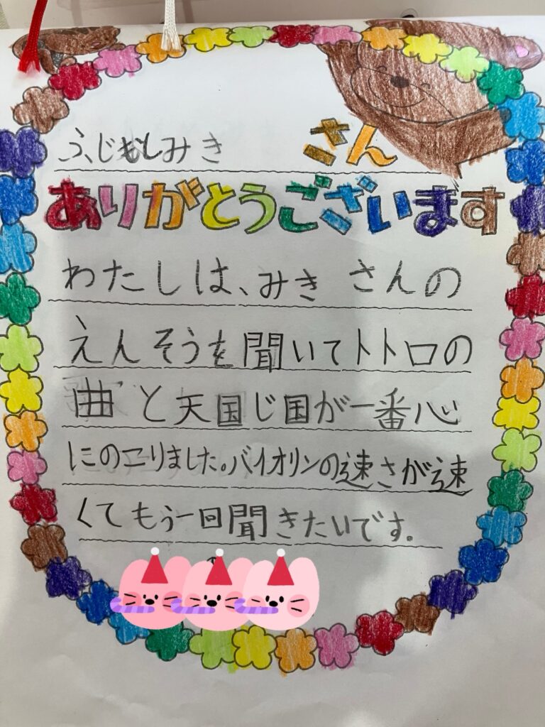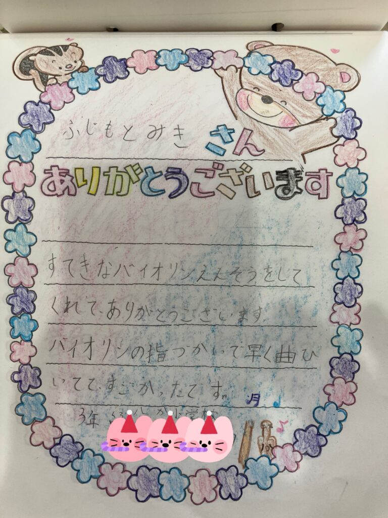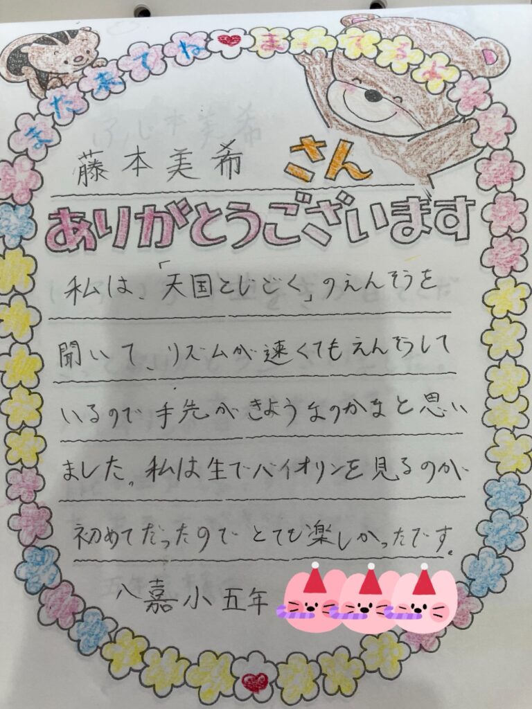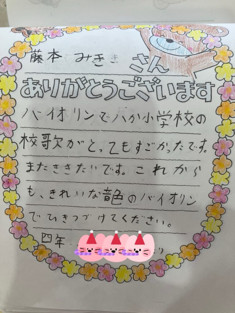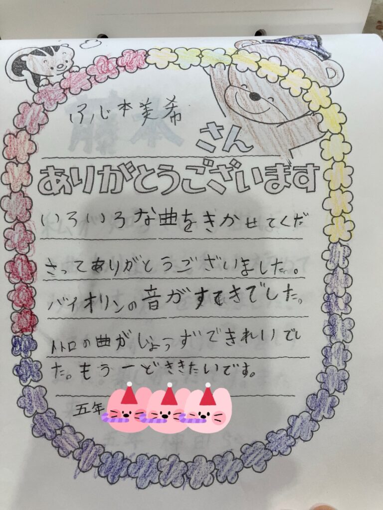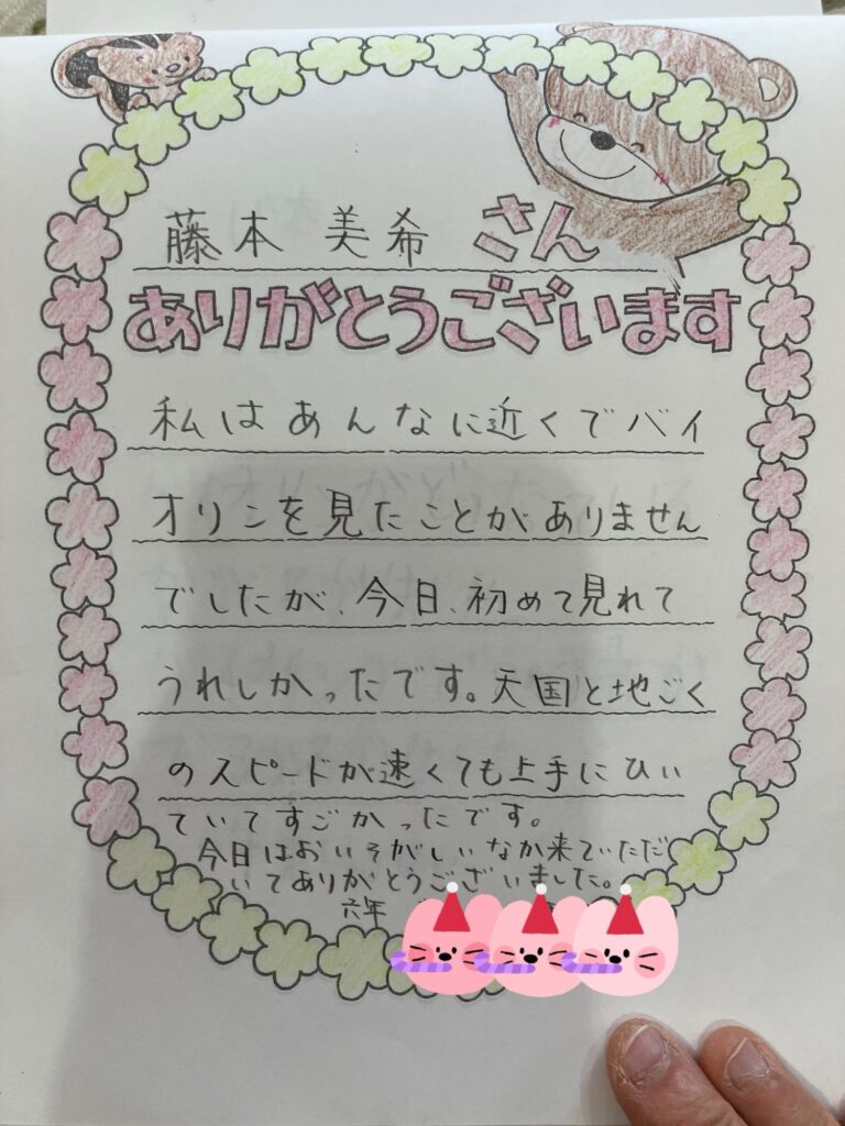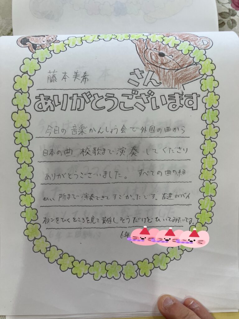 昨年10月玉名市の小学校でスクールコンサートをした時の感想文集が送られて来ました。100名以上ありましたが抜粋したのだけ載せます。「涙が出た」とか「綺麗だった」とか人間に1番ぐらい大事な感情を引き出せる芸術をやってて良かったーと思える言葉です。ミスがない、とありますが、これは演奏の時は一応楽譜は置いておりますが、ほぼ全曲暗譜しないと1秒以内の指の準備、弓の角度等の脳からの指令が間に合いません。それだけコンサートをするのは準備が必要なので、玉名でのスクールコンサートは卒業することになりました。感想文ありがとうございました。