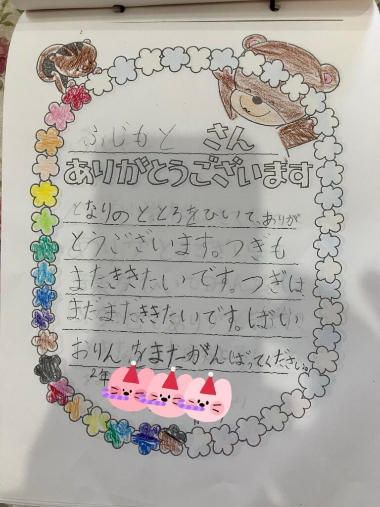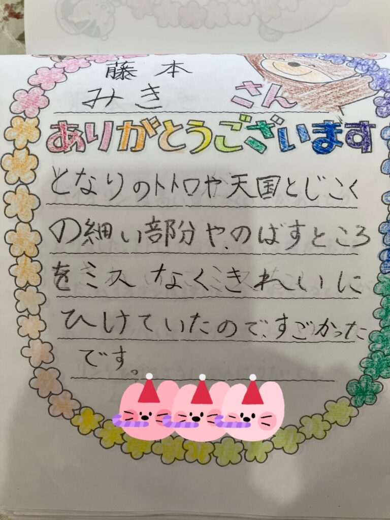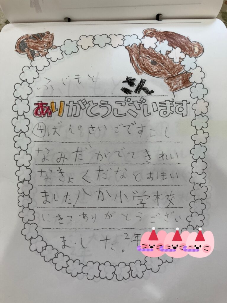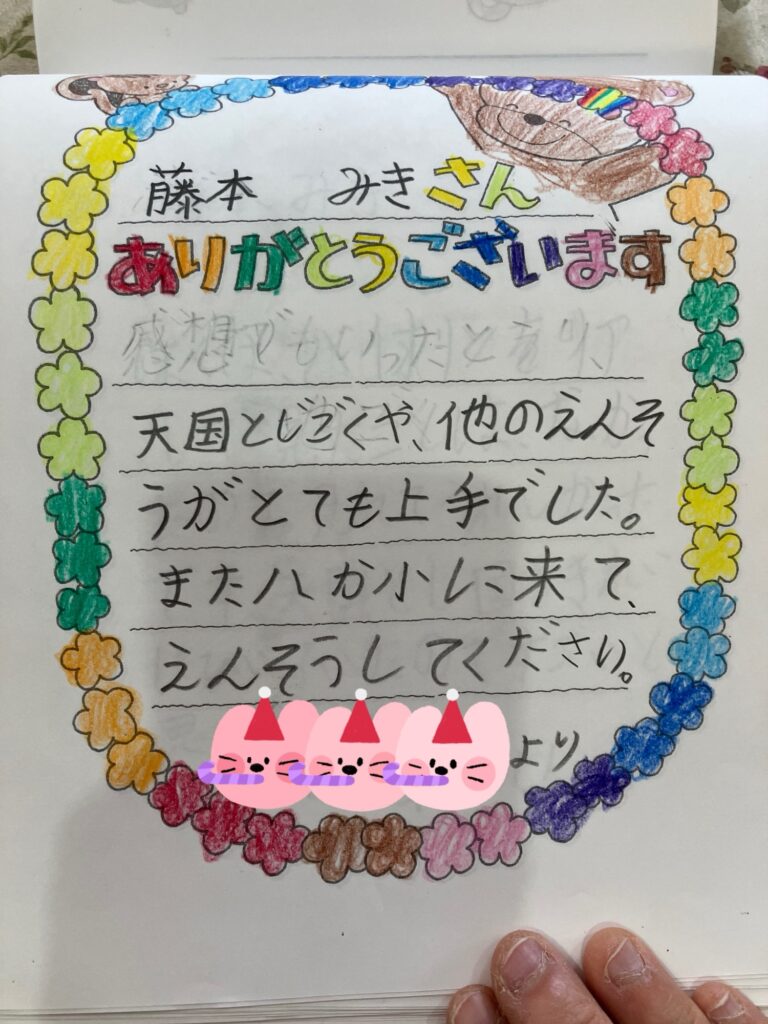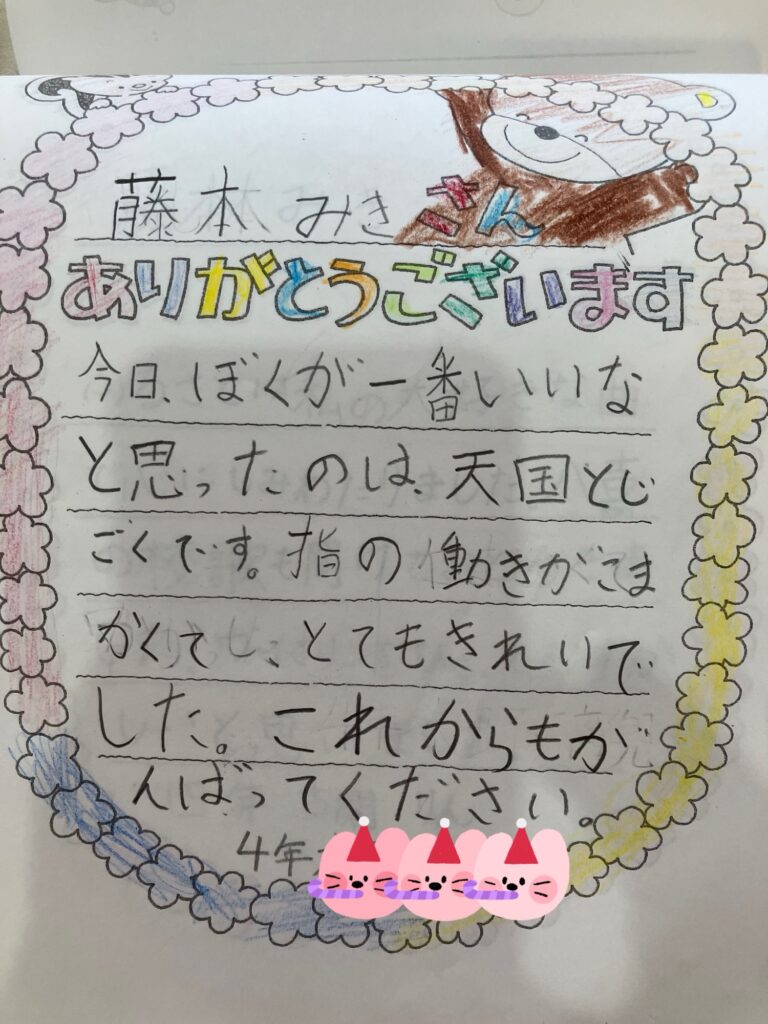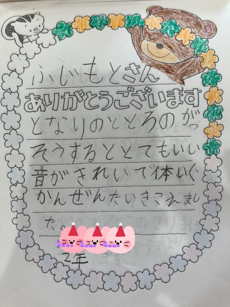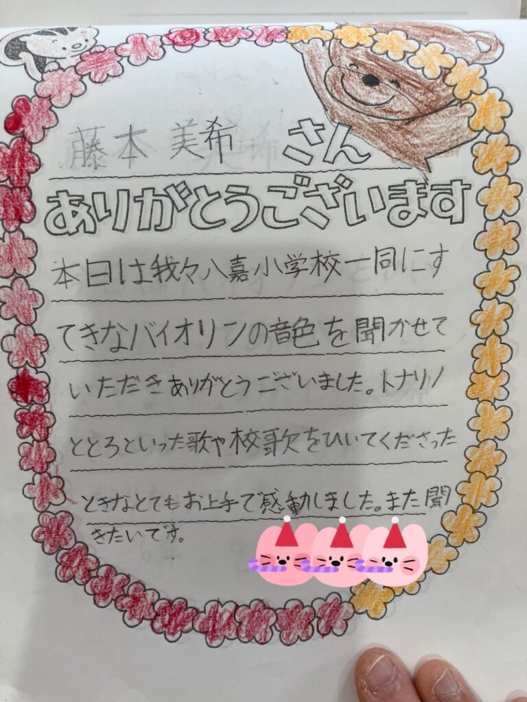 昨年10月玉名市の小学校でスクールコンサートをした時の感想文集が送られて来ました。100名以上ありましたが抜粋したのだけ載せます。「涙が出た」とか「綺麗だった」とか人間に1番ぐらい大事な感情を引き出せる芸術をやってて良かったーと思える言葉です。ミスがない、とありますが、これは演奏の時は一応楽譜は置いておりますが、ほぼ全曲暗譜しないと1秒以内の指の準備、弓の角度等の脳からの指令が間に合いません。それだけコンサートをするのは準備が必要なので、玉名でのスクールコンサートは卒業することになりました。感想文ありがとうございました。